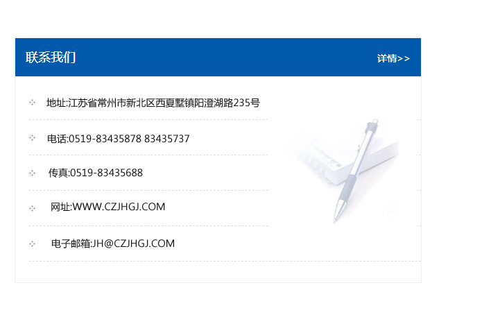 傳真:0519-83435688    郵編:213135    網址:WWW.czjhgj_com.chgrc.com    電子郵箱:JH@czjhgj_com.chgrc.com